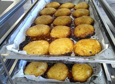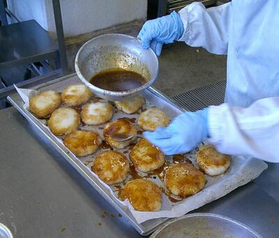 また、愛知県・長野県・岐阜県の山間部の郷土料理「五平餅」も提供します。ご飯をつぶし、串にさし、甘辛い味噌をぬって焼いた料理です。給食では、もち米も混ぜたご飯をつぶし、丸めて成型し、手作りの味噌ごまだれをぬって焼きました。
