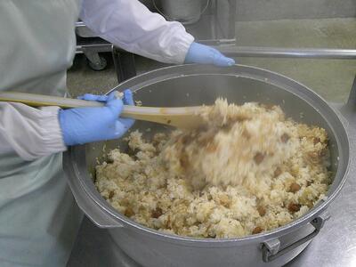 甘辛く煮つけたたこをご飯に混ぜて提供します。また、兵庫県の特産品である「そうめん」を使った汁物を提供します。