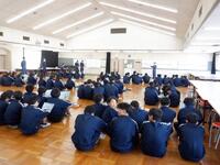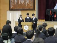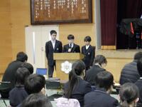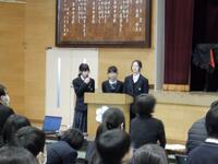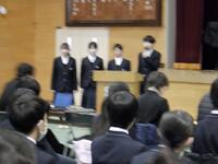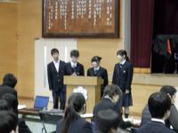 1月8日(木)3学期が始まりました。始めに全員で校歌を合唱しました。校歌の指揮、伴奏を担当した3年生の生徒も始業式等で全校生徒の前で行うのはこれが最後になりました。お疲れさまでした。校歌合唱の後、校長から年頭の話がありました。「昔から1月は行く、2月は逃げる、3月は去ると言われあっという間に過ぎて行ってしまいます。目標を明確にもち流れる時に押し流されぬよう充実した日々を過ごしていきましょう。」と話がありました。始業式終了後、生活指導主任から「休み中困ったことや悩みごとがあった人は先生或いは相談窓口に相談してください。また人、物、時間を大切に過ごしてください。」と話がありました。今年度も残りわずかとなりました。時間を大切に有意義に過ごしていきましょう。最後になりましたが本年もよろしくお願いいたします。