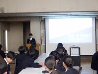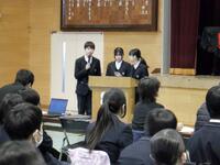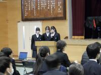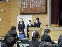 1月21日(水)朝礼の時間に生徒会主催の進路激励会がありました。感染症予防のため、オンラインでの開催となりました。始めに1、2年生一人一人が書いたメッセージカードを、美術部と生徒会でポスターにしたものを3年生の代表者に手渡しました。その後生徒会長の先導のもと、1、2年生で、「フレフレ3年生」、「がんばれ、がんばれ3年生」、「ファイト、ファイト3年生」とエールを送りました。校舎中に響いた声は3年生にも届き励みになったことでしょう。