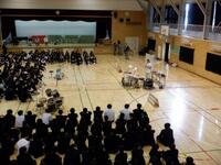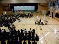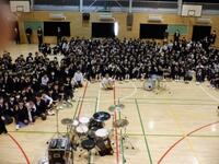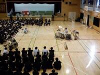11月19日(火)の5時間目に日野市民会館主催のアウトリーチ事業として、PEGGYさんのドラムコンサートがありました。PEGGYさんはグッドモーニングアメリカのドラマーとして活躍されています。始めに米津玄師の『IRIS OUT』の演奏がありました。ドラムってこんな音が出るのかというほど凄い迫力で引き込まれました。その後、3人の生徒が代表して全員の前でレッスンを受けました。内容は1,2,3,4とくりかえし右手でハイハットを叩き、1,3で足でバスドラムを叩き、2,4で左手でスネアドラムを叩き、ときどき1でシンバルを叩くといったものでした。これらを組み合わることで、実は『IRIS OUT』のサビの部分を演奏できるといったものでした。3人とも曲に合わせて演奏することができていました。最後にPEGGYさんの演奏で歌いたい人を募集したところ、2年生の女子生徒が立候補してくれて、こっちのけんとの『はいよろこんで』を演奏に合わせて歌いました。終わりにPEGGYさんから自分も中学生のころからドラムを始めて続けているので、みなさんもやりたいことをあきらめないで続けてほしいとメッセージをいただきました。