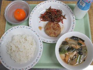 *アピールポイント:ハンバーグの中にえのきを入れたことです。ハンバーグの中に入れることで、えのきの味があまりしないので、苦手な人でも食べやすいようにしました。また、旬の食べ物として味噌汁に「大根」と「長ねぎ」を入れました。さらに、日野産の食べ物として、「大根」「長ねぎ」に加え、「にんじん」と「卵」も使い、日野産の食材も食べられるメニューを考えました。