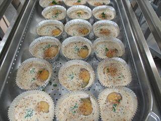 「卵のおかか蒸し」は、アルミカップにひとつひとつ卵を割り入れ、