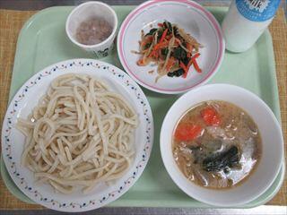 *アピールポイント:「豚汁」で「豚肉」を使うことで、体を作るたんぱく質や、疲労回復に役立つビタミンB1を多く摂取できるようにしました。また、「納豆サラダ」は、ボリューミーでお腹いっぱいになれるとともに、野菜がしっかり摂れ、彩りも良くしました。さらに、主菜・副菜ともに「かつおぶし」を使うことで、だしをきかせ、少ない塩分でもおいしく食べられるようにしました。うどんを豚汁につけて食べてください!