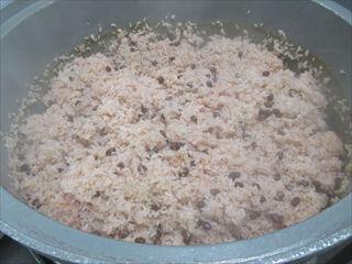 お赤飯は、小豆を入れて炊き込みました。小豆を下茹でしたときのゆで汁も使ったので、きれいな赤色に仕上がりました。
