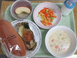 *アピールポイント:メインは、旬の「タラ」を使ったイタリア料理の「アクアパッツア」にしました。旬の食べ物は、栄養価が高くておいしいです。また、キャベツ、にんじん、じゃがいもなど、この時期に収穫予定の日野産食材を取り入れることも意識しました。さらに、野菜をたくさん使ったことで、栄養バランスが良く、また彩りも良くしました。