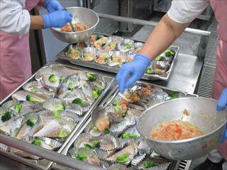 魚介類や野菜などを煮込んで作る「アクアパッツア」は、旨味たっぷりの料理です。この料理名の由来には諸説ありますが、イタリア語でacquaは「水」、pazzaは「暴れる」や「狂った」という意味があり、調理中に鍋の中で水が激しく沸騰する様子から名付けられたという説があります。給食では、鍋の代わりにアルミカップを使いました。