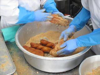 きな粉揚げパンは、パンを高温の油でさっと揚げ、きな粉、砂糖、少量の塩をまぶして仕上げます。給食で人気メニューのひとつです☆