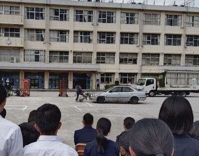 警察署とスタントマンの方に来ていただき、自転車の安全な乗り方や事故の危険性を教えてもらいました。
