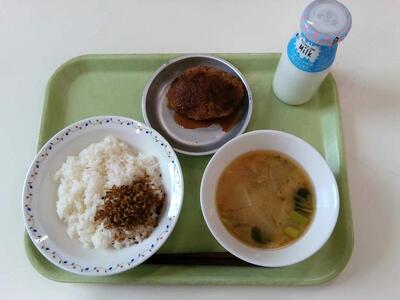 *ごはん・だしがらふりかけ・キャベツたっぷりおからメンチカツ・平山汁・牛乳