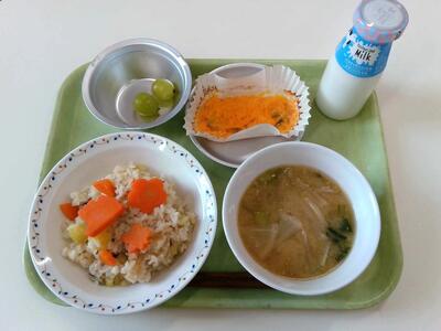 *もみじごはん・魚のもみじ焼き・根菜のごま汁・シャインマスカット・牛乳