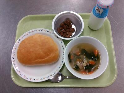*油淋鶏サンド・ABCスープ・ココアアーモンド・牛乳