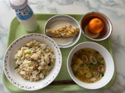 *焼きハムチャーハン・魚のねぎ味噌蒸し・ニェンガオ入りスープ・みかん・牛乳
