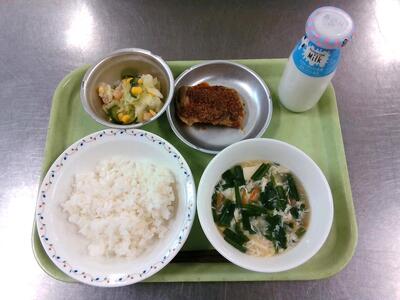*ご飯・ヤンニョムフィッシュ・ビーンズサラダ・にら玉スープ・牛乳