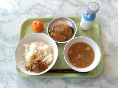 *ご飯・東光寺沢庵の胡麻炒め・ほっけのおろしかけ・豚汁・みかん・牛乳