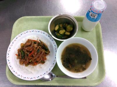 *プルコギ丼・生姜きゅうり・春雨スープ・牛乳
