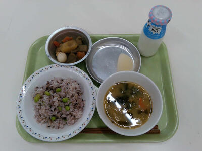 *萩ごはん・秋の煮物・みそ汁・梨・牛乳