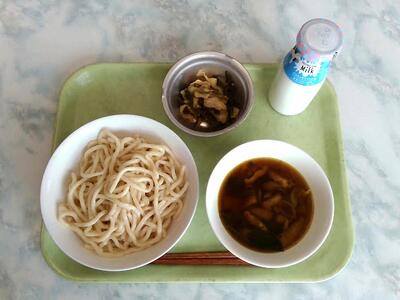 *カレーつけうどん・茎わかめのピリ辛・牛乳