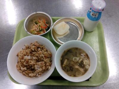*大豆とごぼうのそぼろごはん・バンサンスー・もずくのみそ汁・梨・牛乳