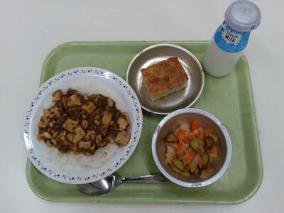 *陳さんの麻婆丼・トマトドレッシングサラダ・紅茶ケーキ・牛乳