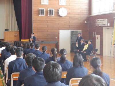 本日、道徳地区公開講座を全校生徒を対象に体育館で行いました。