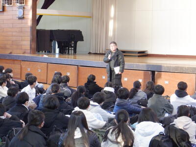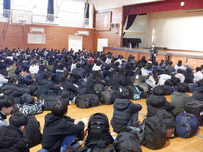 終業式では始業前から整列が完了し、整然と待っている姿はとても立派で、集団としての成長をとても感じました。明日から冬休みになります。家族とともに過ごす時間も増えます。団らんの時間を大切にし、疲れた体をゆっくり休めましょう。3学期は、3年生は受験と卒業に向けて、1,2年生は次の学年に向けての学期となります。さらに成長した皆さんの姿を期待しています。