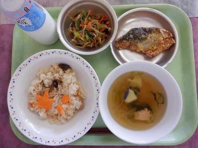 献立:吹き寄せ御飯・鯖の竜田揚・和え物・すまし汁・牛乳