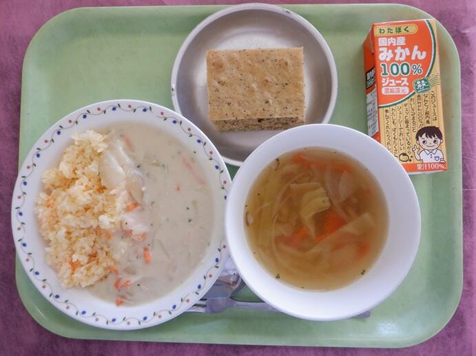 献立:キャロットライスのホワイトソースかけ・野菜スープ・紅茶ケーキ・牛乳