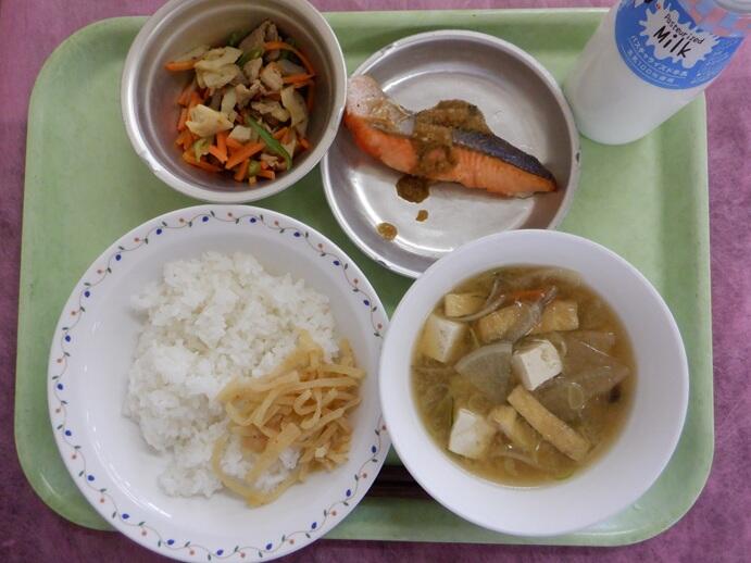 献立:御飯・東光寺たくあん・魚のねぎソース・五目金平・味噌汁・牛乳