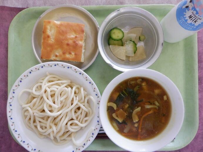 献立:カレーうどん・野菜のかぼす醬油・ヨーグルトポムポム・牛乳