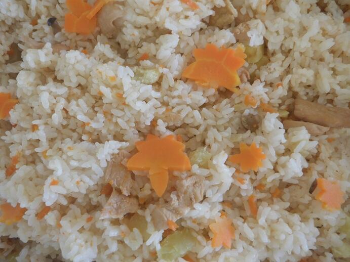 日野産の人参を紅葉型にカットし、御飯に散らします。