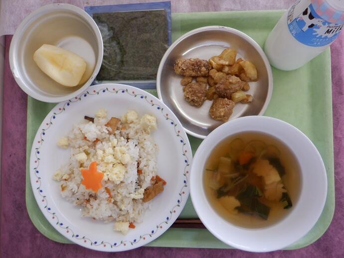 献立:手巻五目寿司・魚と芋の更紗揚・すまし汁・果物(日野産りんご)・牛乳