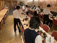 ◯3日目の朝です。食事係も朝食の準備を手伝ってくれています。まだまだ寝足りない生徒が多いようですが、今日は班別タクシー行動ですので、朝食を食べて最後までしっかり頑張りましょう。