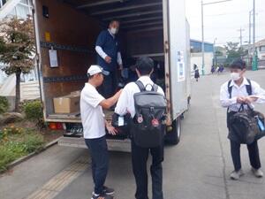 〇3年生は、朝の登校時に、修学旅行用の荷物をトラックに積み込みました。明日からはいよいよ修学旅行(京都・奈良)です。荷物は一足先に出発し、京都の宿で皆さんを待っています。