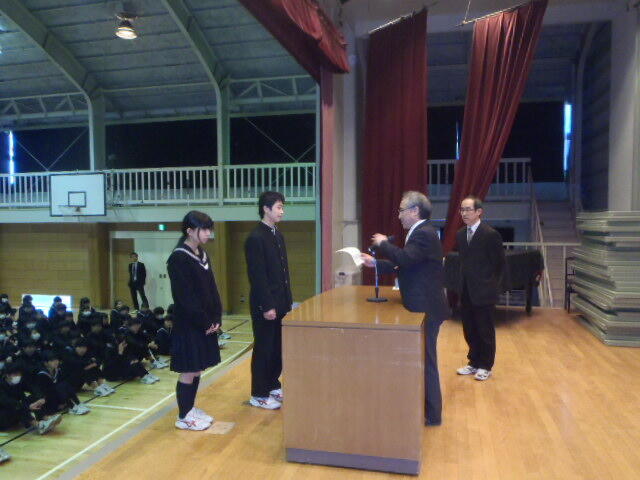 校歌斉唱のあと、校長先生の講話があり、その後表彰と、田村生活指導主任からのお話がありました。