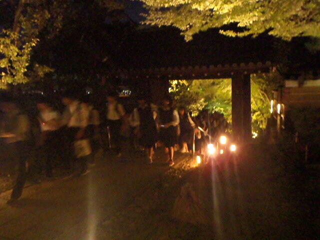 食事のあとは、高台寺に移動して能の観劇体験です。能の様子は撮影禁止でしたが、その後で代表生徒が衣装を着る体験ができました。夜の高台寺は七生中の貸切となりました。