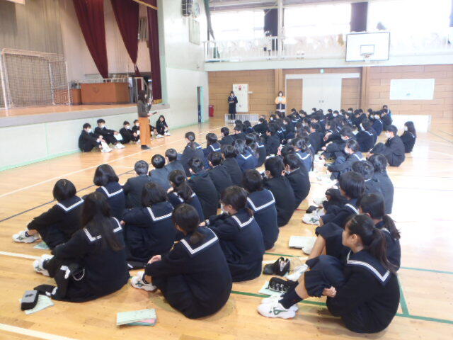5時間目に体育館で事前学習が行われました。生徒は集中して三日間の活動内容などを確認しました。