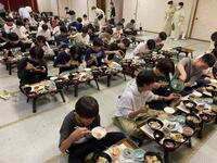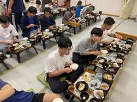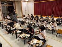○夕食の時間です。たくさん食べて今日の疲れを癒やしてください。係会では、今日の反省と明日の連絡をしました。