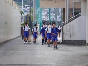 〇終学活後、災害時や不審者対応等における集団下校訓練を実施しました。まだまだ暑さは続きますが、来週から授業が始まりますので、月曜日にまた元気に登校しましょう。