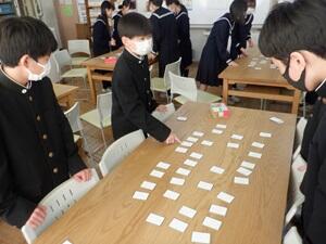 〇1年国語。百人一首の授業の様子です。上の句を詠んだだけで、札をとれる人もいました。すごいですね。