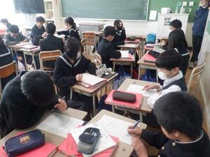 〇1年のスキー移動教室が終わり、平常の授業に戻りました。3年生は模擬テストに取り組んでいました。1,2年生も感染症等の広がりはなく、皆元気に生活しています。
