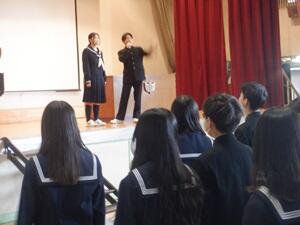 令和7年3月7日(金)全校朝礼、2年理科全国学力・学習状況調査CBT予備テスト・6組「3年生を送る会」