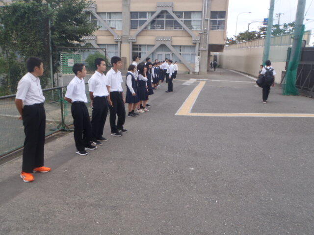 今日から二学期が始まります。保護者や地域の皆様方のご協力のもとで、あいさつ運動が行われました。