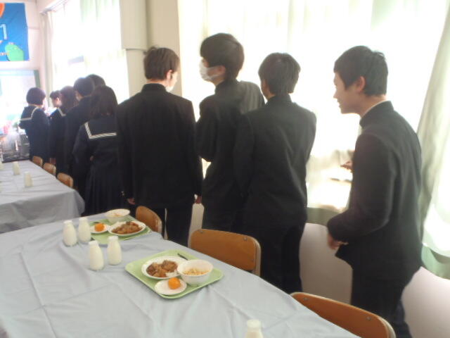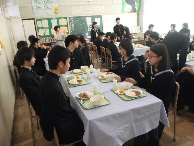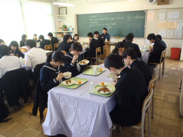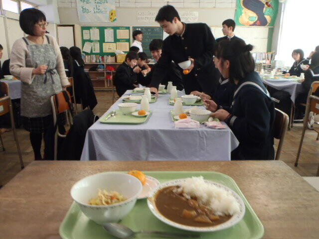 担任の関先生は生徒席で一緒に給食を味わっていました。