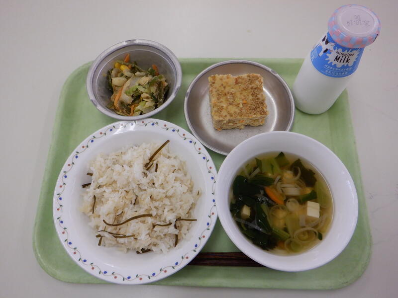 SDGs昆布ごはん  おから入り松風焼き  茎わかめと野菜のごま醤油  わかめと豆腐のすまし汁  牛乳
