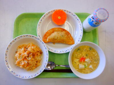 今日の主食は「キムタクご飯」です。「キムチ」と「たくあん」の入ったご飯ですが、「たくあん」は地元東光寺の農家さんが塩とぬかだけで漬けた「東光寺たくあん」を使っています。今日は各クラスで本校オリジナルの動画「日野の名産 東光寺ダイコン」の動画を視聴しました。